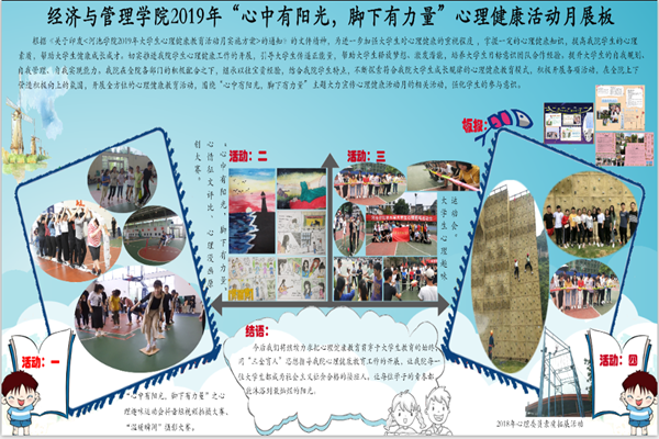 为提升我院大学生心理素质,积极培育和践行社会主义核心价值观,根据《河池学院2019年大学生心理健康活动月实施方案》的通知要求,我院加强宣传,广泛动员,严格按照学校的通知要求圆满完成了所有的活动内容。其中心情征文、“温情瞬间”摄影比赛、心理漫画、“同一屋檐下”电子板报与心理趣味运动会“抖音短视频”比赛五项比赛,我院在院内进行了初赛并设置了相应奖项,同时选择了部分优秀代表作品报至学校参赛,得到了同学们的积极响应与广泛参与。