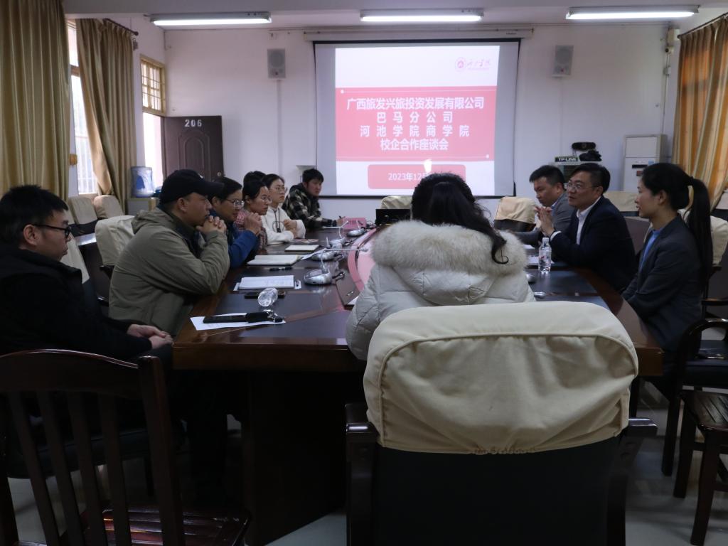 12月27日下午,我院与广西旅发兴旅投资发展有限公司巴马分公司于行政楼206开展校企合作座谈会。我院党委书记韦书觉、办公室主任刘红领、广西旅发兴旅投资发展有限公司巴马分公司总经理符传颖、行政人事经理黄志、前厅经理李春花、我院教研室主任代表、专业教师代表以及学生代表参会。会议由韦书觉主持。